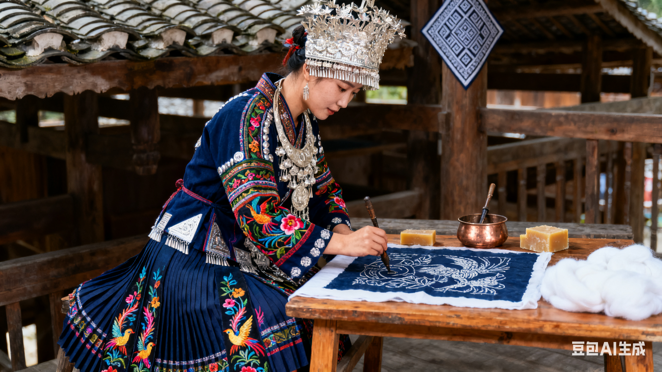 苗族蜡染是一种传统的民间染色技艺,有着悠久的历史。早在秦汉时期,苗族人民就掌握了蜡染技术,在宋代达到鼎盛。蜡染的原理是用蜡封住织物纤维,防止染液浸入,从而形成图案。在染色过程中,蜡自然开裂,形成独特的 “冰纹”。苗族蜡染的装饰图案记录了苗族的社会历史、图腾崇拜、神话传说和宗教文化。